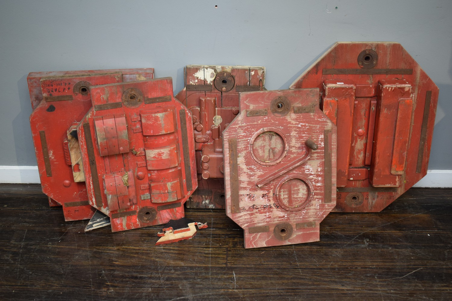 A COLLECTION OF SIX WOODEN MOLDS (A/F) (LARGEST 77H x 61W x 16D CM) (PLEASE NOTE THIS HEAVY ITEM MUST BE REMOVED BY CARRIERS AT THE CUSTOMER'S EXPENSE. LEONARD JOEL STAFF CANNOT ASSIST CARRYING THIS ITEM) (X-LARGE ITEM)