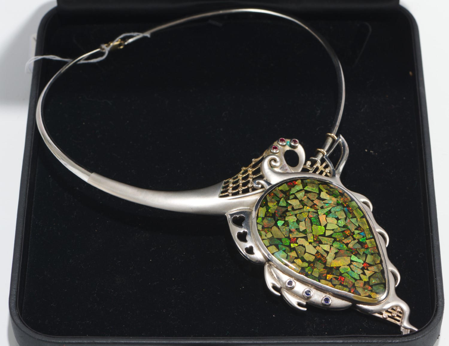 A HAND CRAFTED DESIGNER NECKLACE IN GOLD AND SILVER SET WITH CENTRAL COMPOSITE OPAL PANEL, WITH RUBY, SAPPHIRE AND DIAMOND DETAIL.