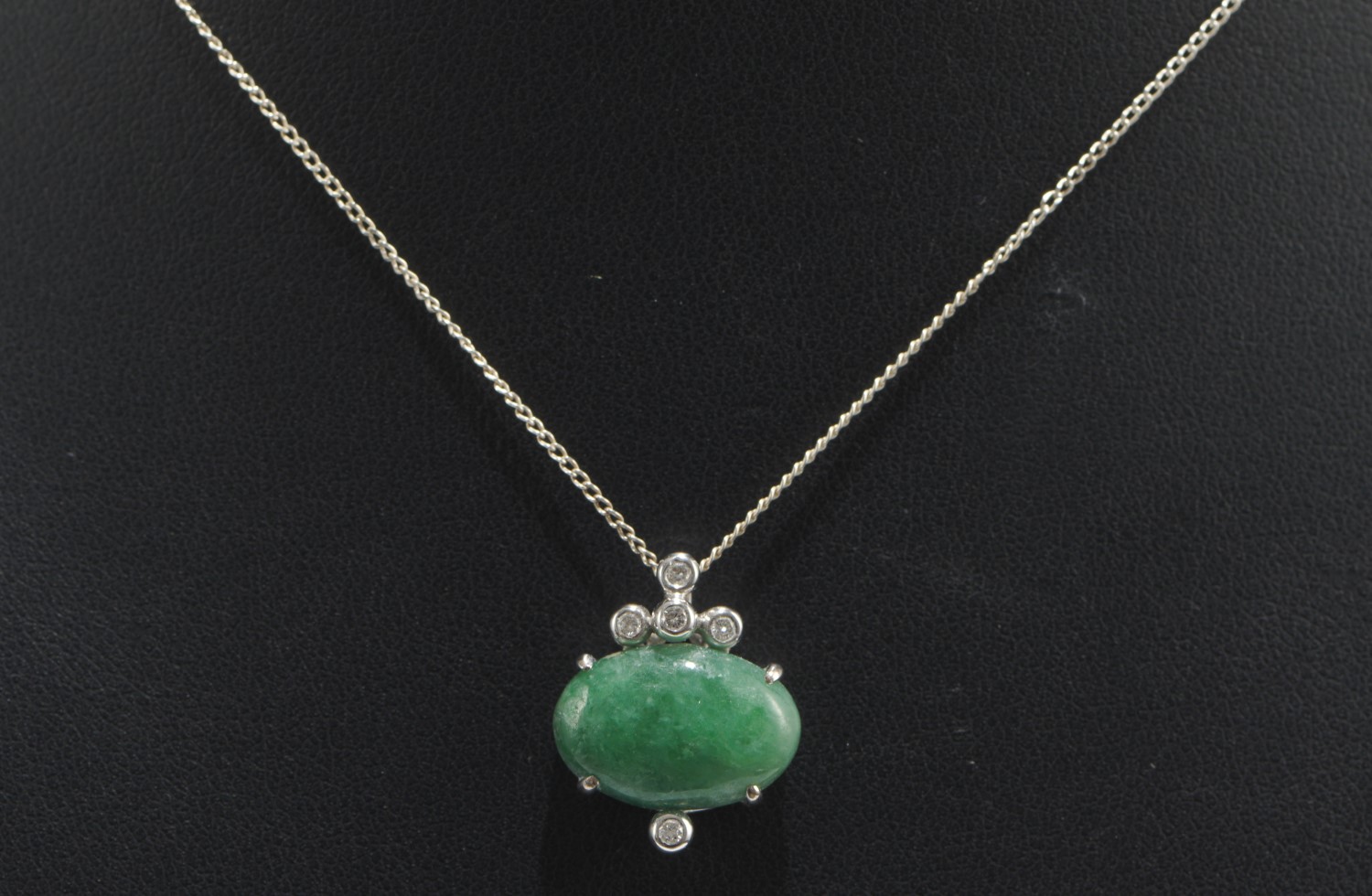 A JADEITE AND DIAMOND PENDANT IN 18CT GOLD, TO A STERLING SILVER CHAIN