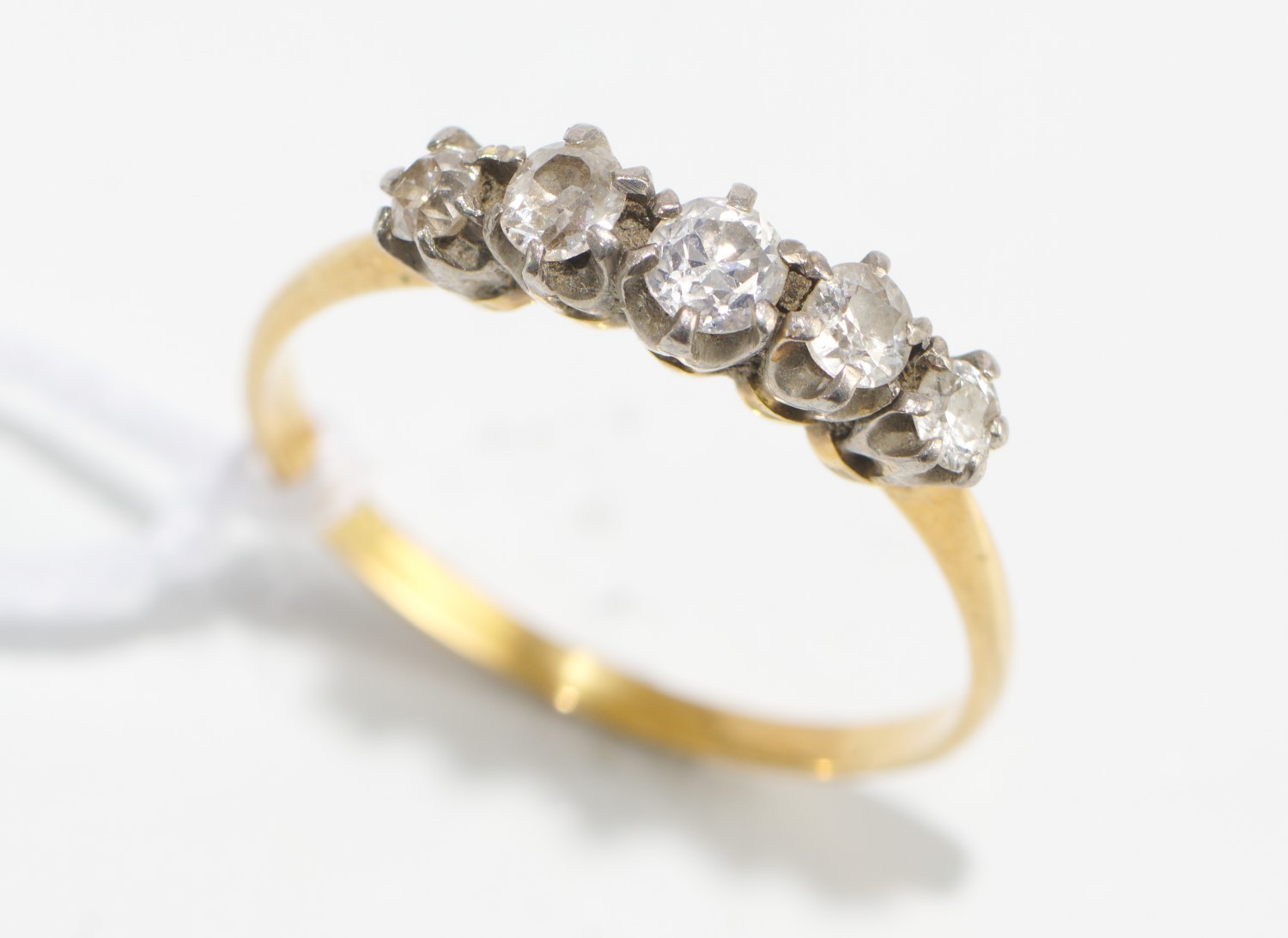 AN ANTIQUE FIVE STONE DIAMOND RING IN 18CT GOLD, SIZE O, 2.1GMS