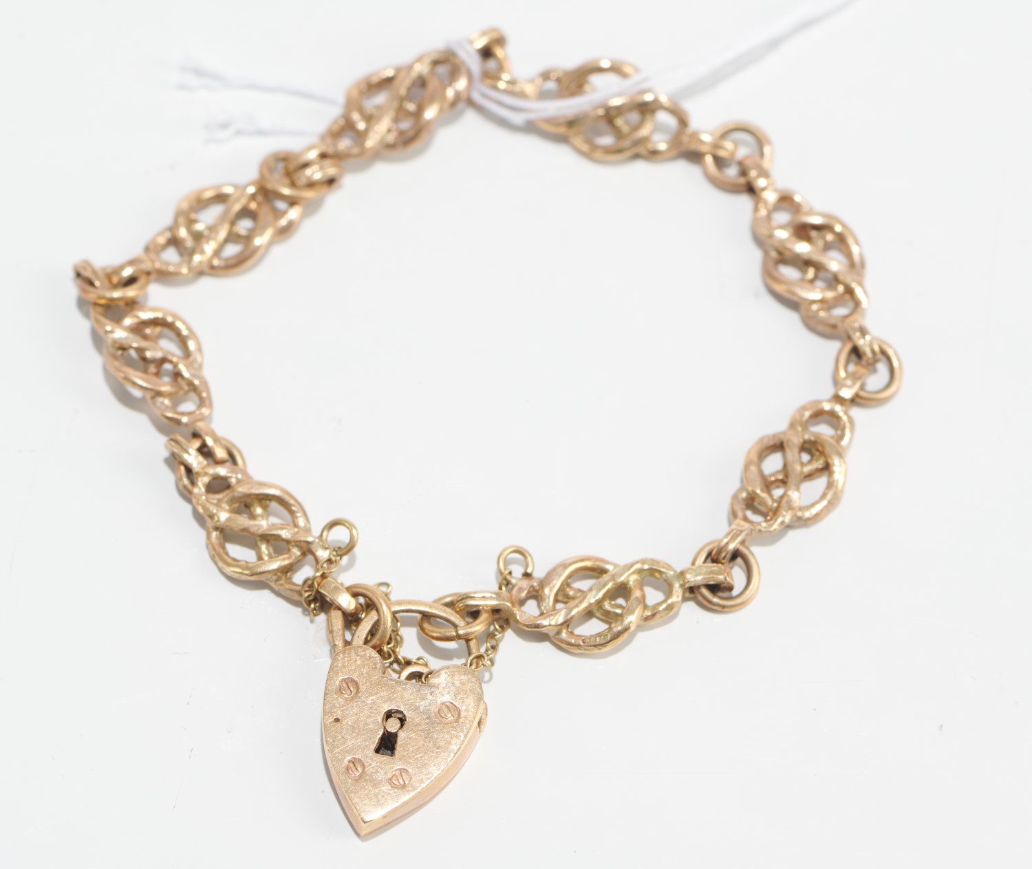 A FANCY LINK HEART PADLOCK BRACELET IN 9CT GOLD, LENGTH 18CM