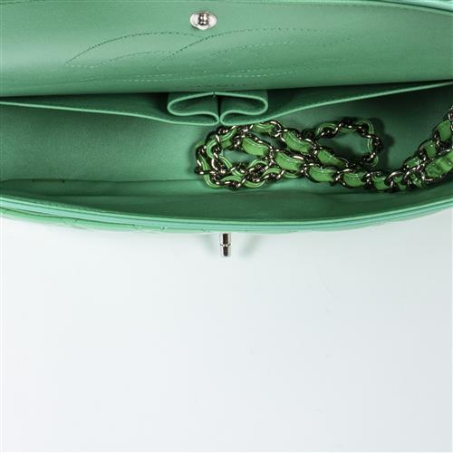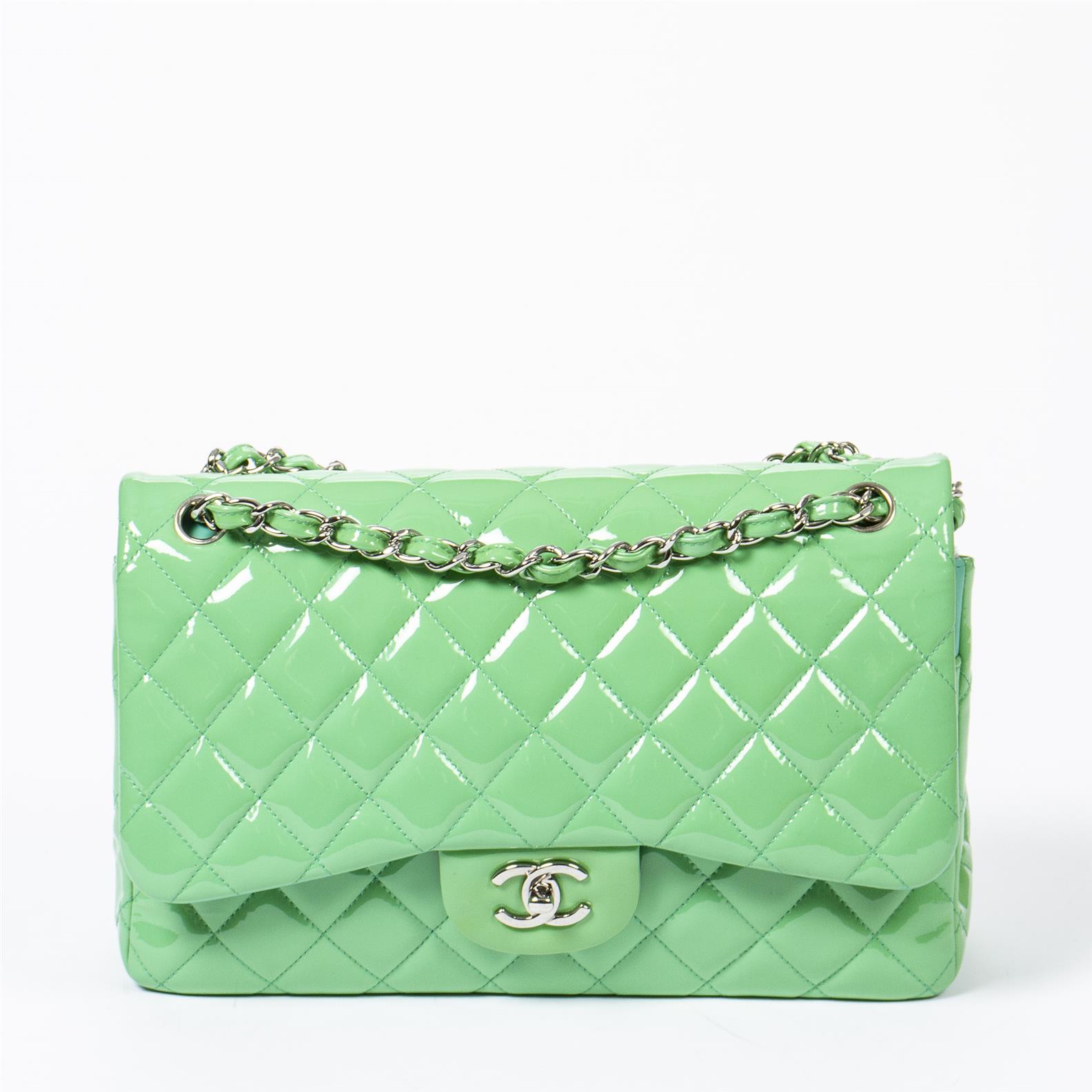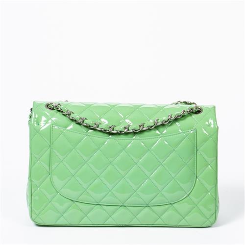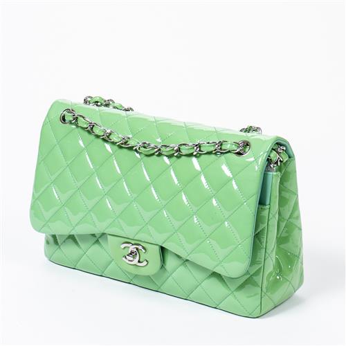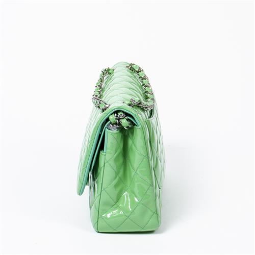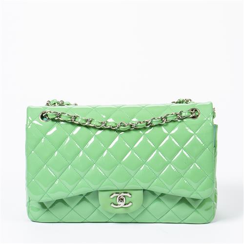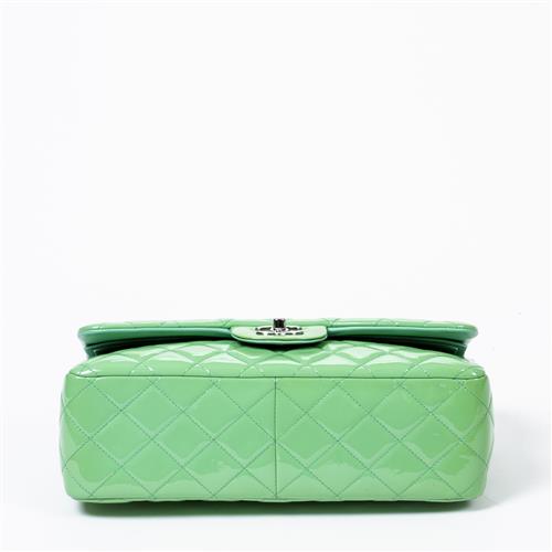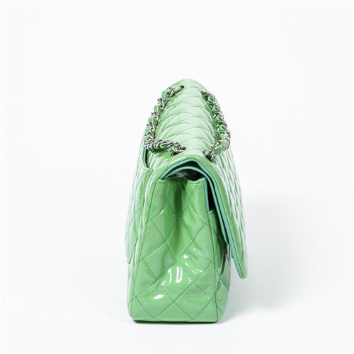 Styled in mint green quilted patent leather with interlaced chain strap and silver tone metal hardware, 30 x 20 x 10cm.