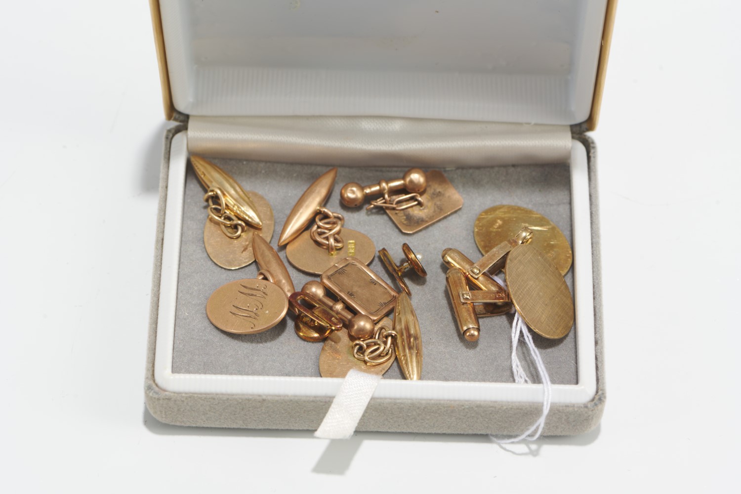 FOUR PAIRS OF CUFFLINKS IN 9CT GOLD, A/F, INCLUDING WILLIAM DRUMMOND & Co, WITH TWO MOTHER OF PEARL DRESS STUDS IN 14CT GOLD.