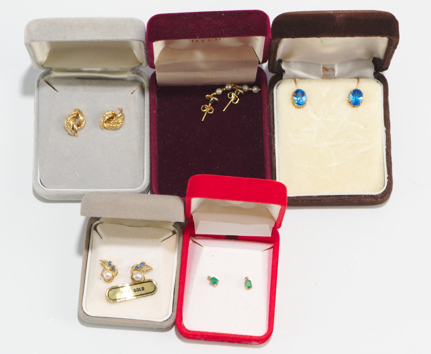 FIVE PAIRS OF EARRINGS INCLUDING PEARL AND SAPPHIRE IN 9CT GOLD.