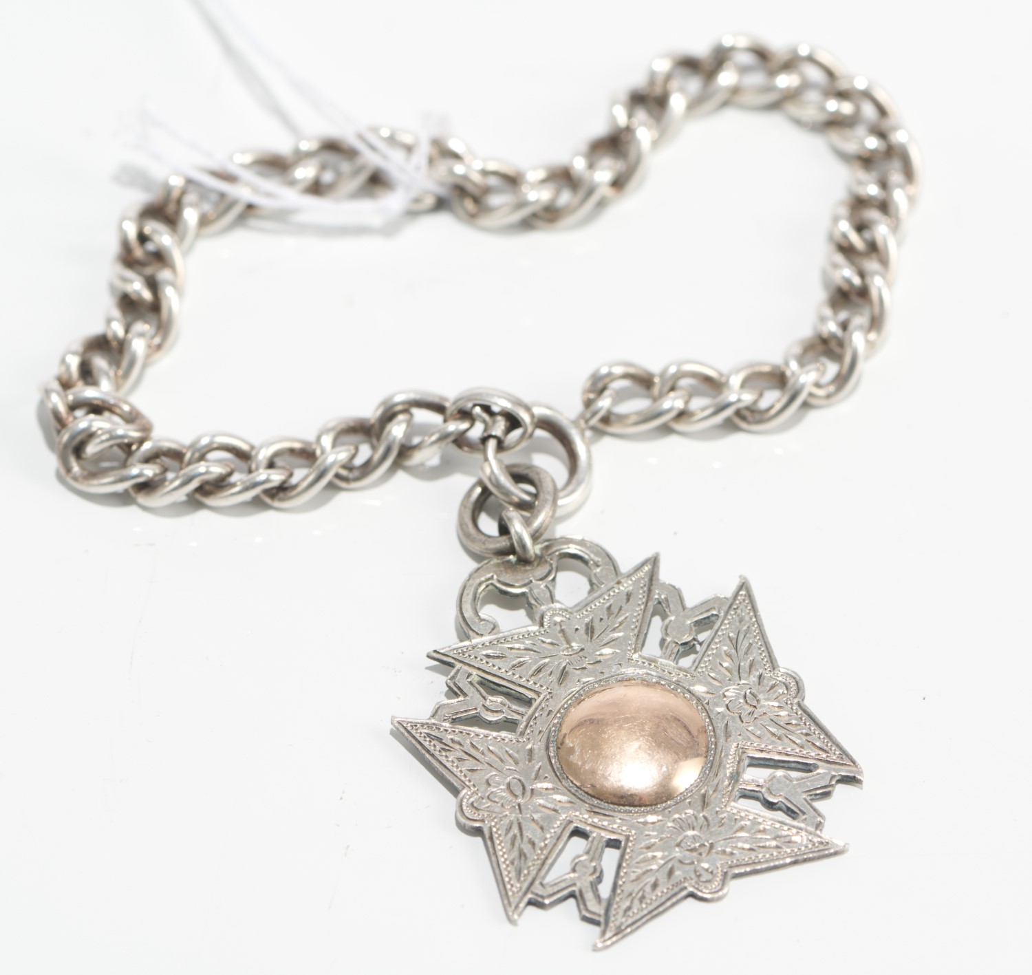 A SPORTING MEDALLION IN STERLING SILVER ENGRAVED CITY R.R H.W. ANDERSON CHAMPION FEB 1940, TO A STERLING SILVER BRACELET, LENGTH 180mm.