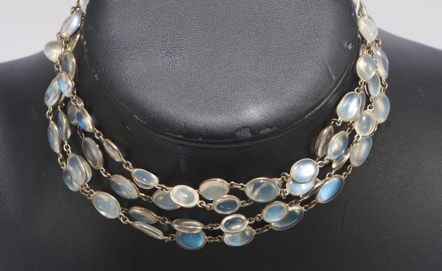 A VINTAGE MOONSTONE NECKLACE IN CONTINENTAL SILVER - NO CLASP 139CM