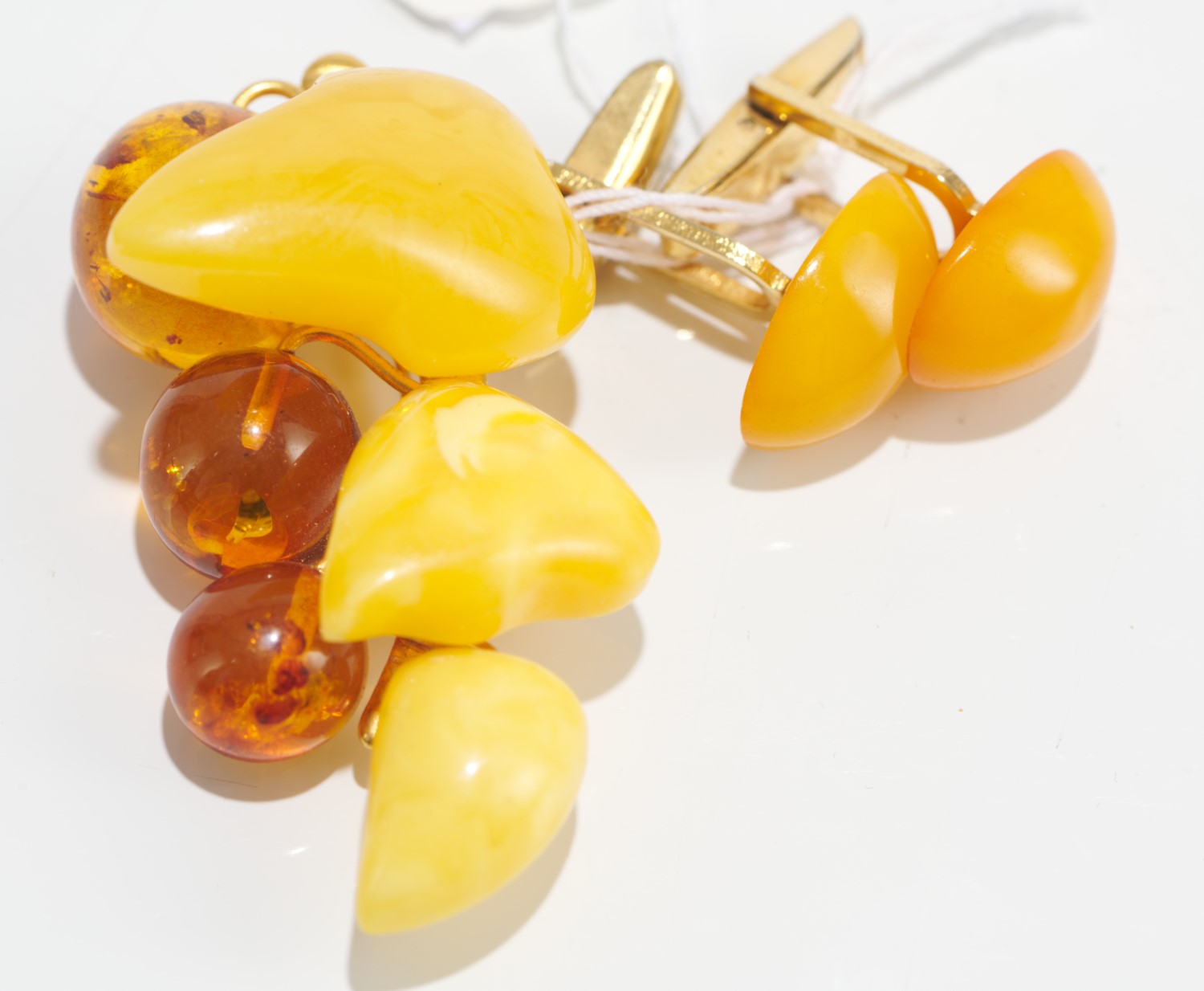 AN AMBER BROOCH WITH RUSSIAN HALLMARK, TOGETHER WITH A PAIR OF AMBER CUFFLINKS.