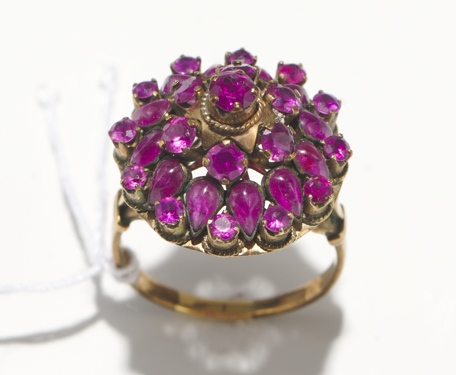 A VINTAGE RUBY CLUSTER DRESS RING IN 14CT GOLD, RING SIZE P.
