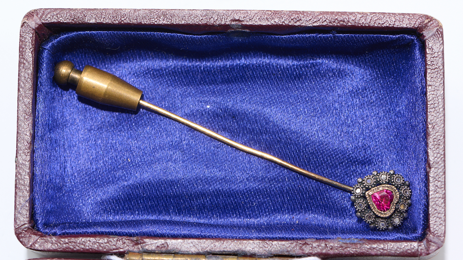 AN ANTIQUE HEART SHAPED SYNTHETIC RUBY AND DIAMOND STICK PIN SET IN SILVER AND GOLD PLATE