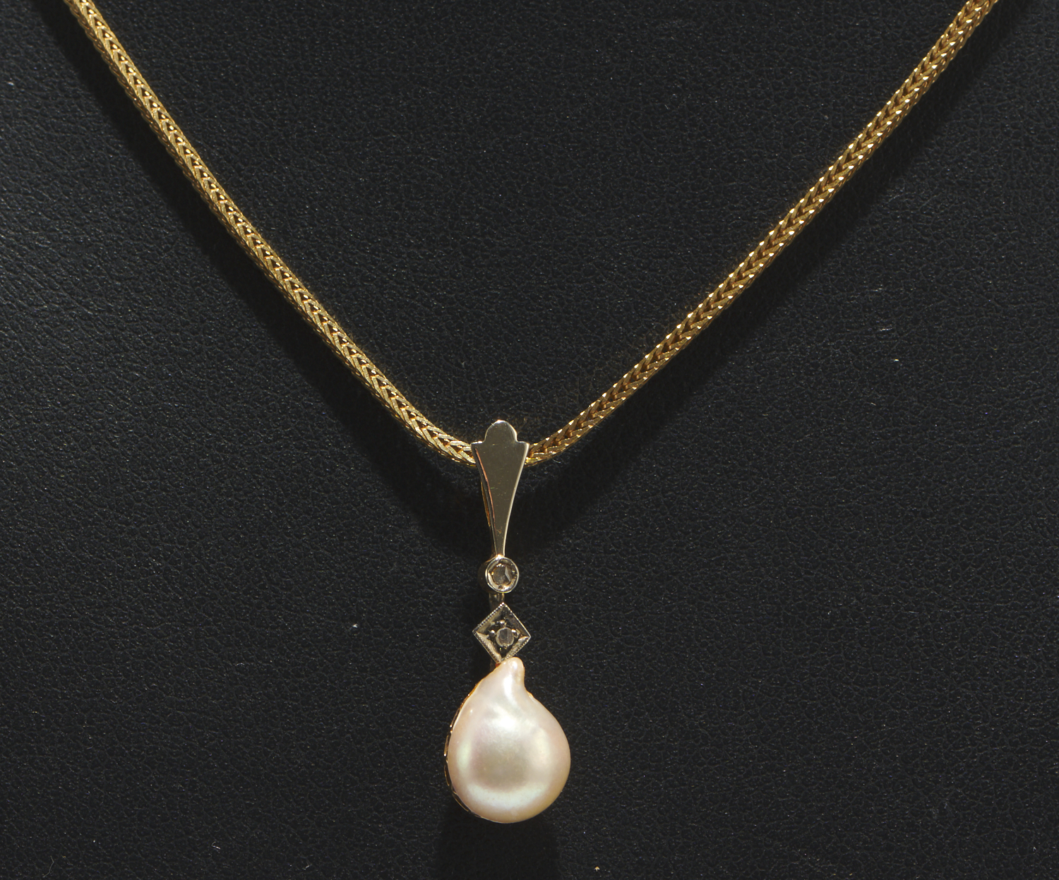 A CULTURED PEARL AND DIAMOND PENDANT TO A SNAKE LINK CHAIN, ALL IN 18CT GOLD
