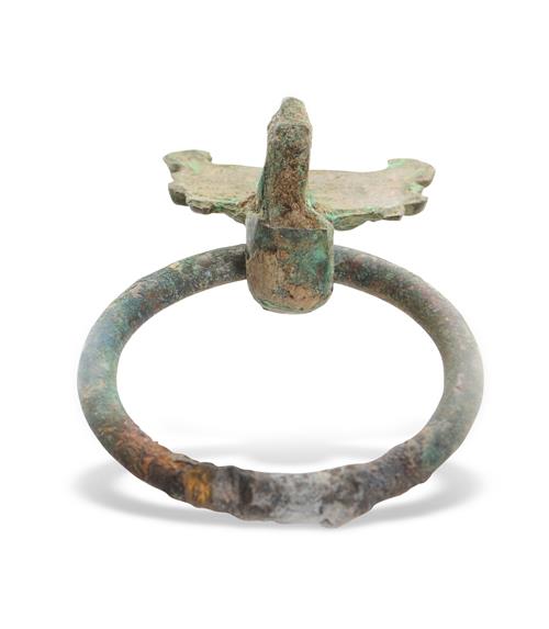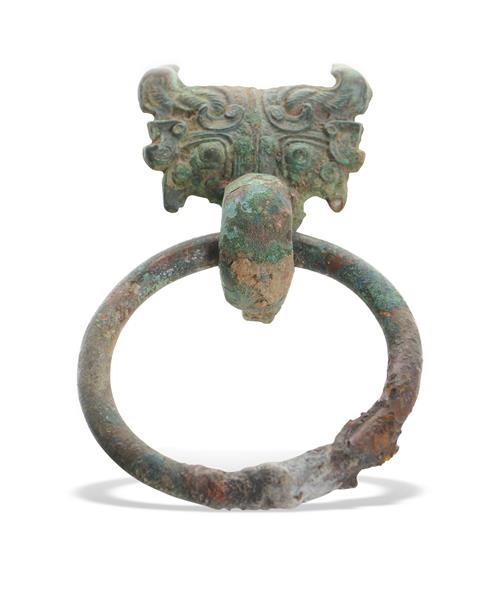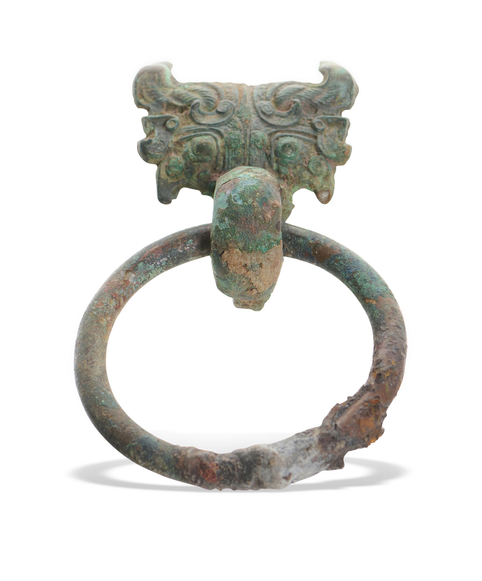 The taotie mask well cast with fine details, supporting a ring handle, covered in a pleasant verdigris patina.