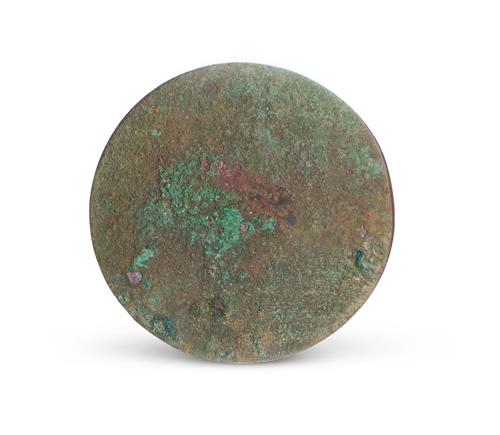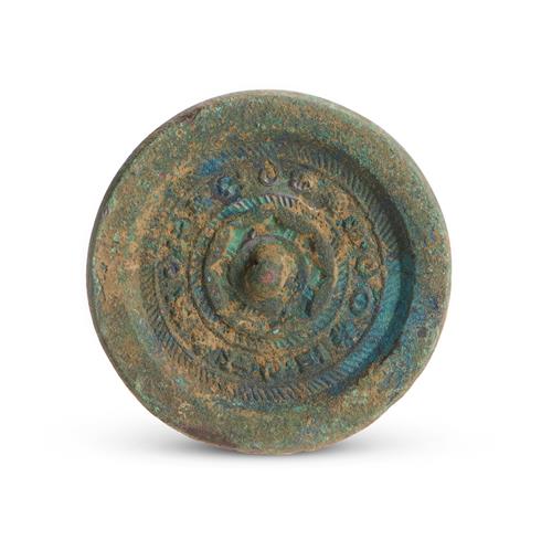 The circular mirror cast with geemetric motifs to the interior, with a rounded boss in the centre. Verdigris patina with azurite.