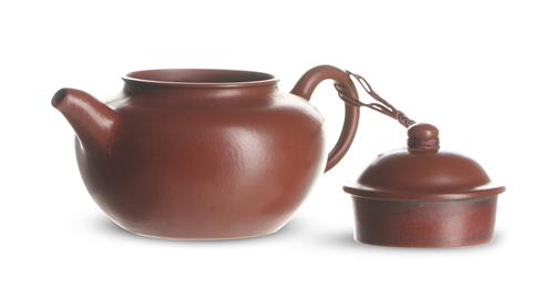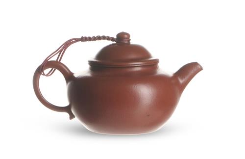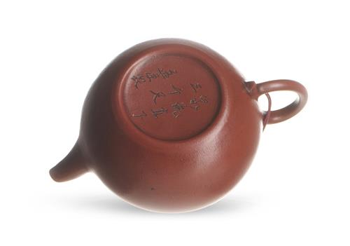 Of compressed globular form in red clay, the base carved with a poem reading 'The waterfall measures three thousand feet', and 'made by Meng Chen'.