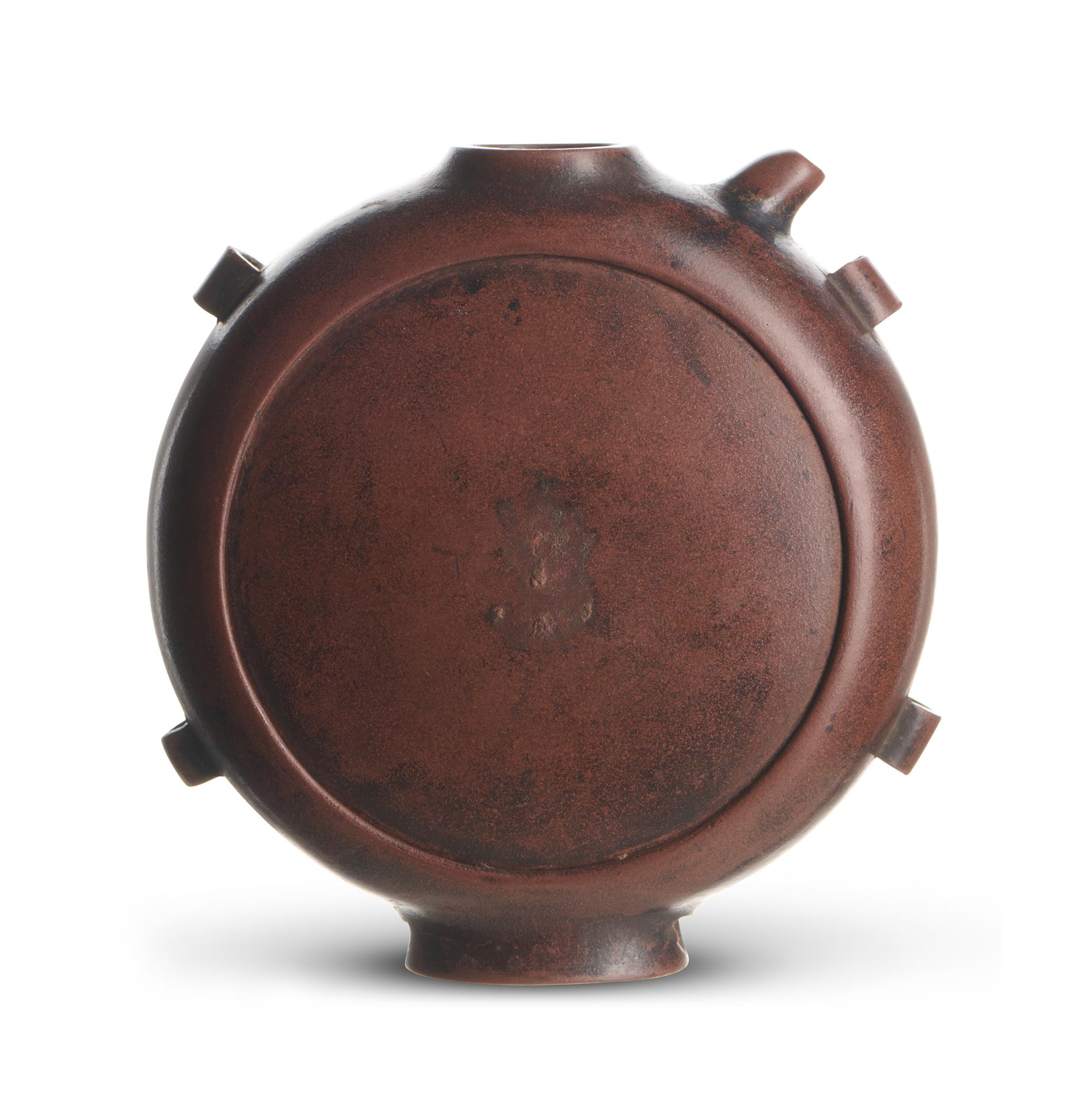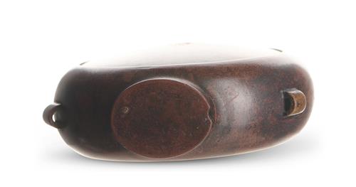 Of flattened spherical form, with lugs for a strap, and a spout to one side.