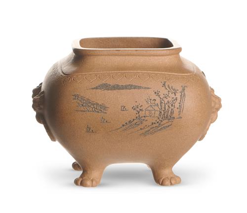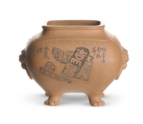 Of archaistic form in yellow clay, with incisde decoration of landscape and ancient coins signed by Ren Yin Ting (1889-1968), and a four character seal mark to the base.