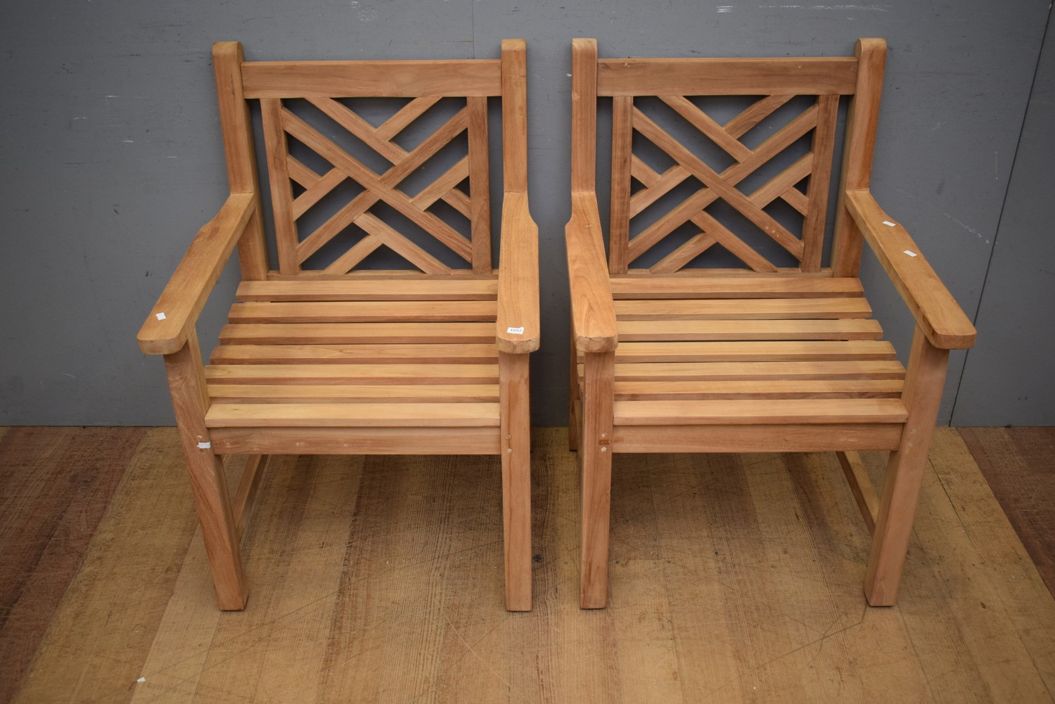 A PAIR OF TEAK CARVER CHAIRS (93H x 64W x 63D CM) (LEONARD JOEL DELIVERY SIZE: LARGE)