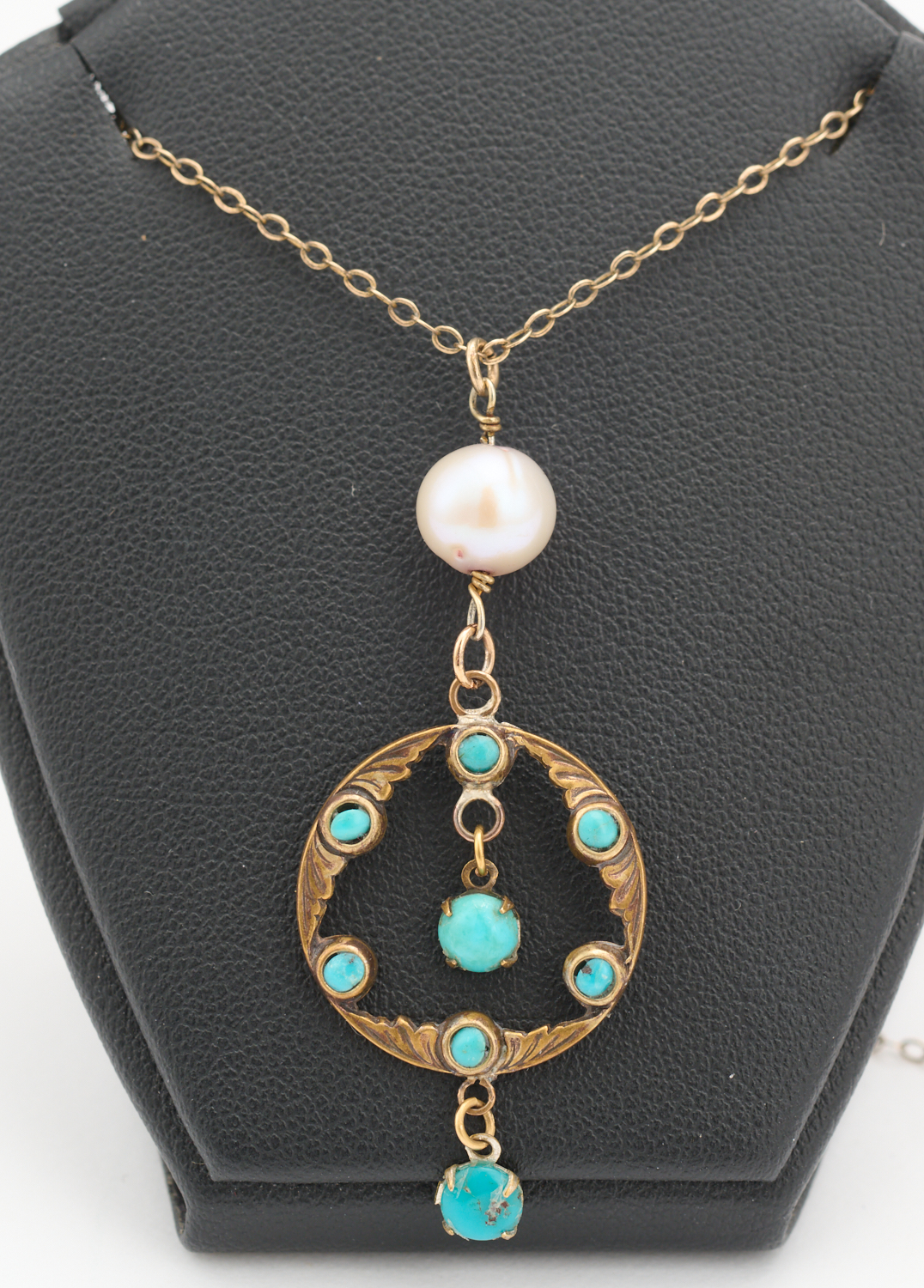 A TURQUOISE AND PEARL PENDANT, TOGETHER WITH A TURQUOISE AND PEARL BROOCH, TOTAL LENGTH 400MM