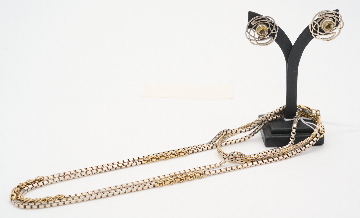 A COLLECTION OF JEWELLERY IN SILVER, COMPRISING A NECKLACE, BRACELET AND A PAIR OF CITRINE EARRINGS TO CLIP ON FITTINGS, 62.9 GMS