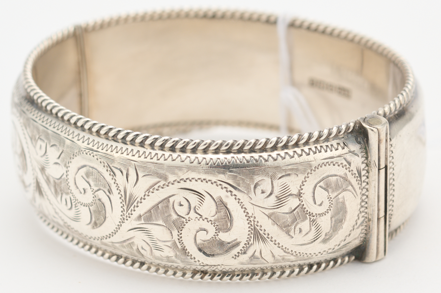 AN ENGLISH CUFF IN STERLING SILVER, HALLMARKED, CIRCA 1960, DIAMETER 55MM, 36.7GMS