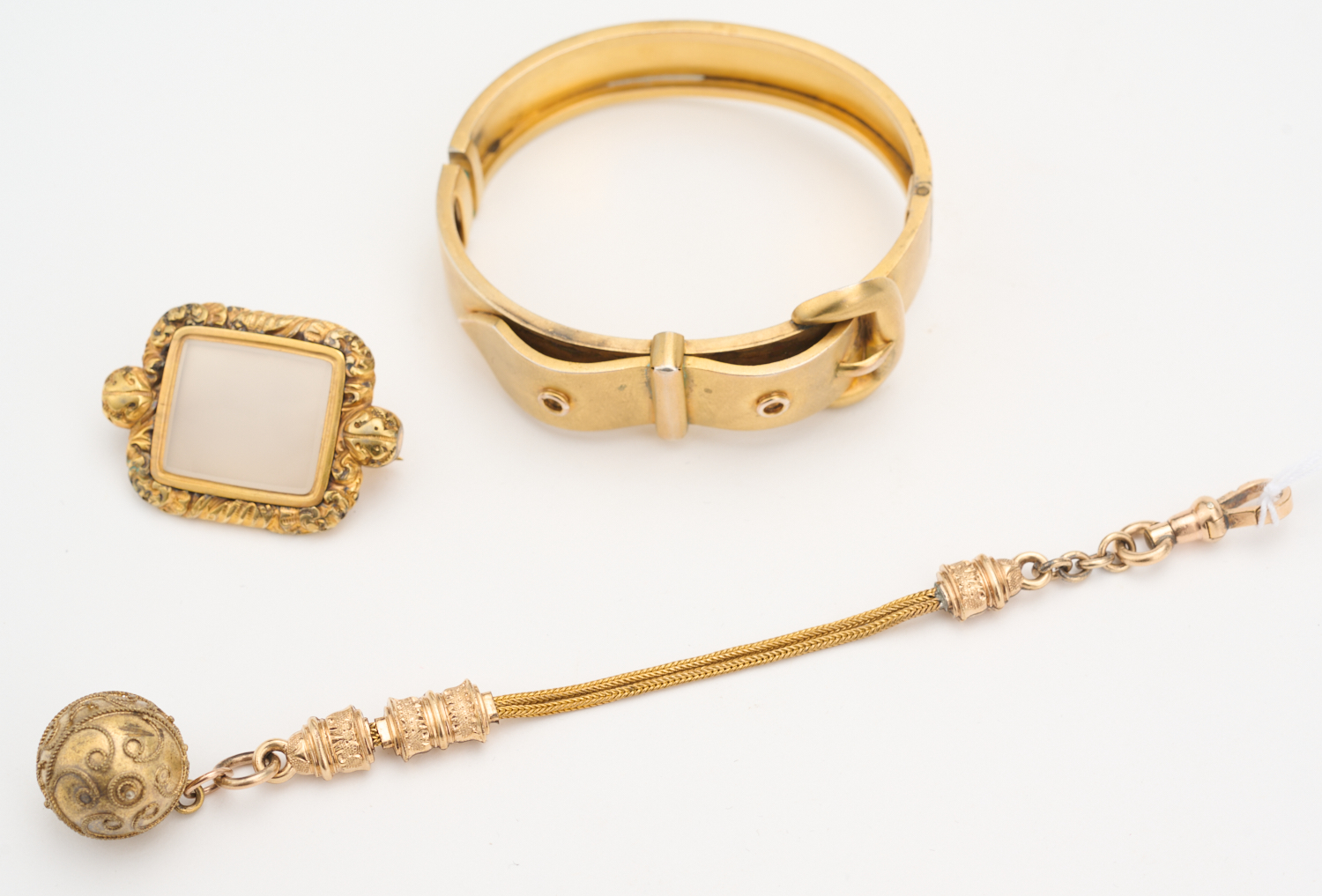 A BANGLE IN SILVER GILT, A WATCH FOB IN GOLD LINED METAL AND A STONE SET BROOCH