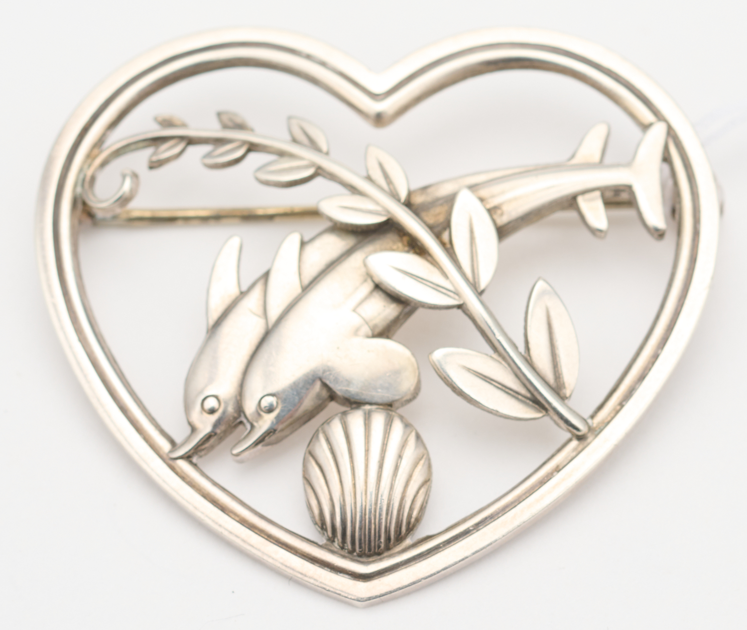 A BROOCH BY GEORG JENSEN, WITH FISH, HEART AND SHELL DESIGN IN STERLING SILVER, REFERENCE NUMBER 312