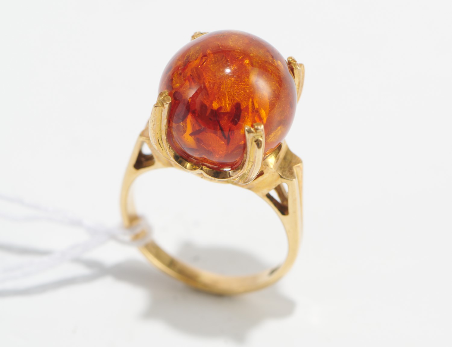 A CLARIFIED AMBER SET RING IN 18CT GOLD, RING SIZE J/K, 5.5GMS
