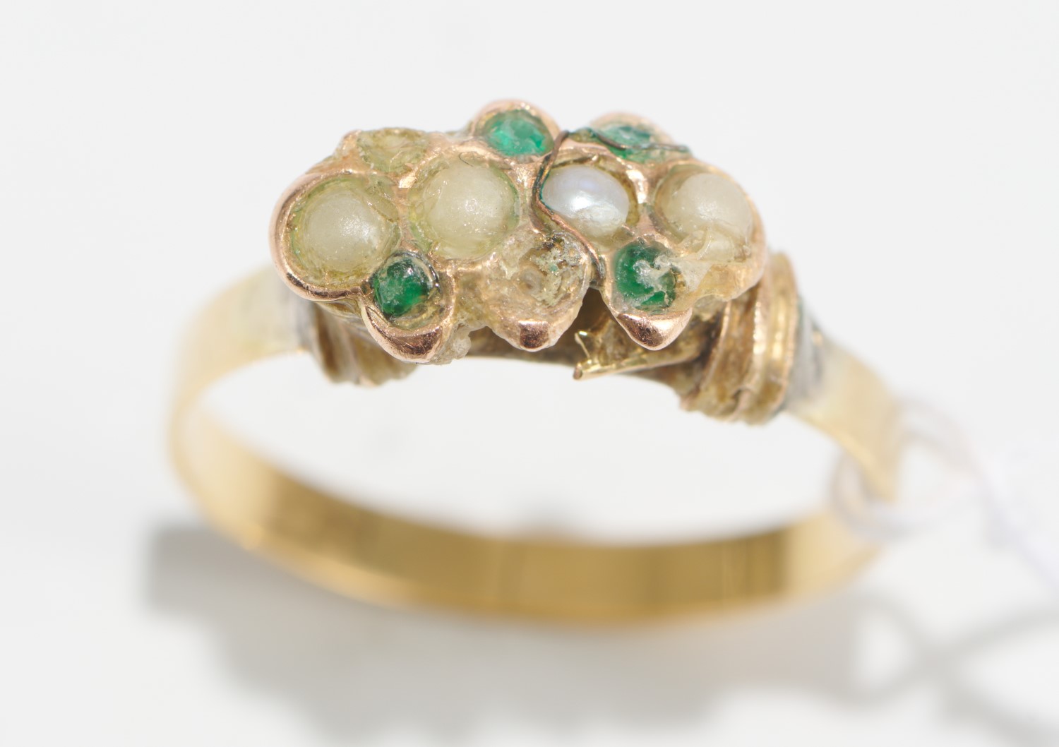 AN EMERALD PASTE AND SEED PEARL SET DRESS RING IN 18CT GOLD, RING SIZE V/W, 3.6 GMS