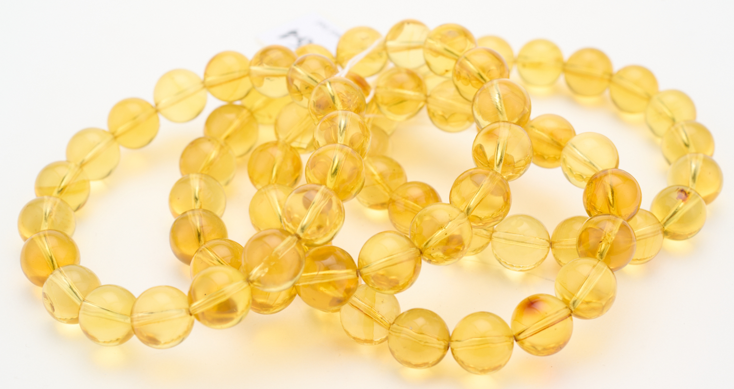 A COLLECTION OF FOUR GREEN AMBER BRACELETS