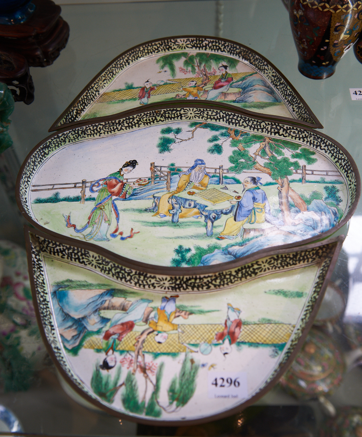 A CHINESE SET OF THREE PLATES, ENAMEL ON COPPER (27.5 CM W), LEONARD JOEL LOCAL DELIVERY SIZE: SMALL
