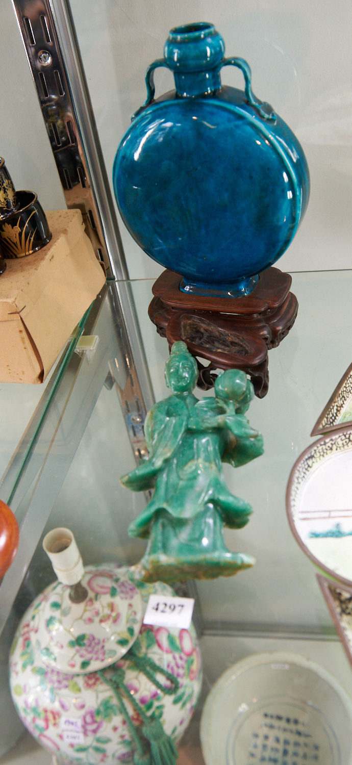 A HARDSTONE CARVING OF QUAN YIN TOGETHER WITH BLUE GLAZE FLASK, LEONARD JOEL LOCAL DELIVERY SIZE: SMALL