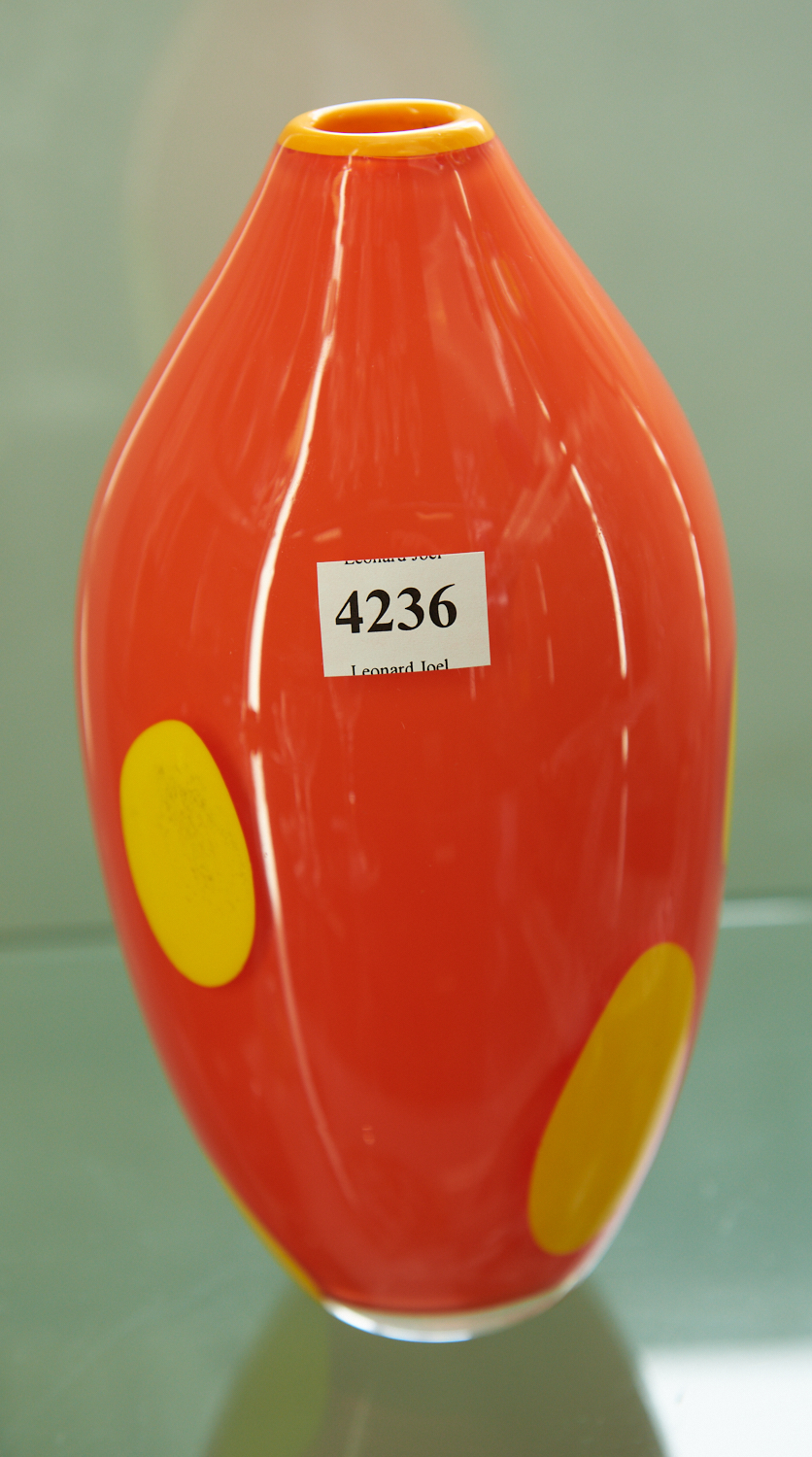 A HAND BLOWN ORANGE AND YELLOW GLASS VASE (21 CM H), LEONARD JOEL LOCAL DELIVERY SIZE: SMALL