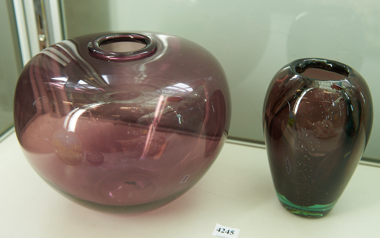 TWO AUSTRALIAN HAND BLOWN GLASS VASES BY MICHAEL HOOK AND RICHARD MORRELL (18 CM H), LEONARD JOEL LOCAL DELIVERY SIZE: SMALL