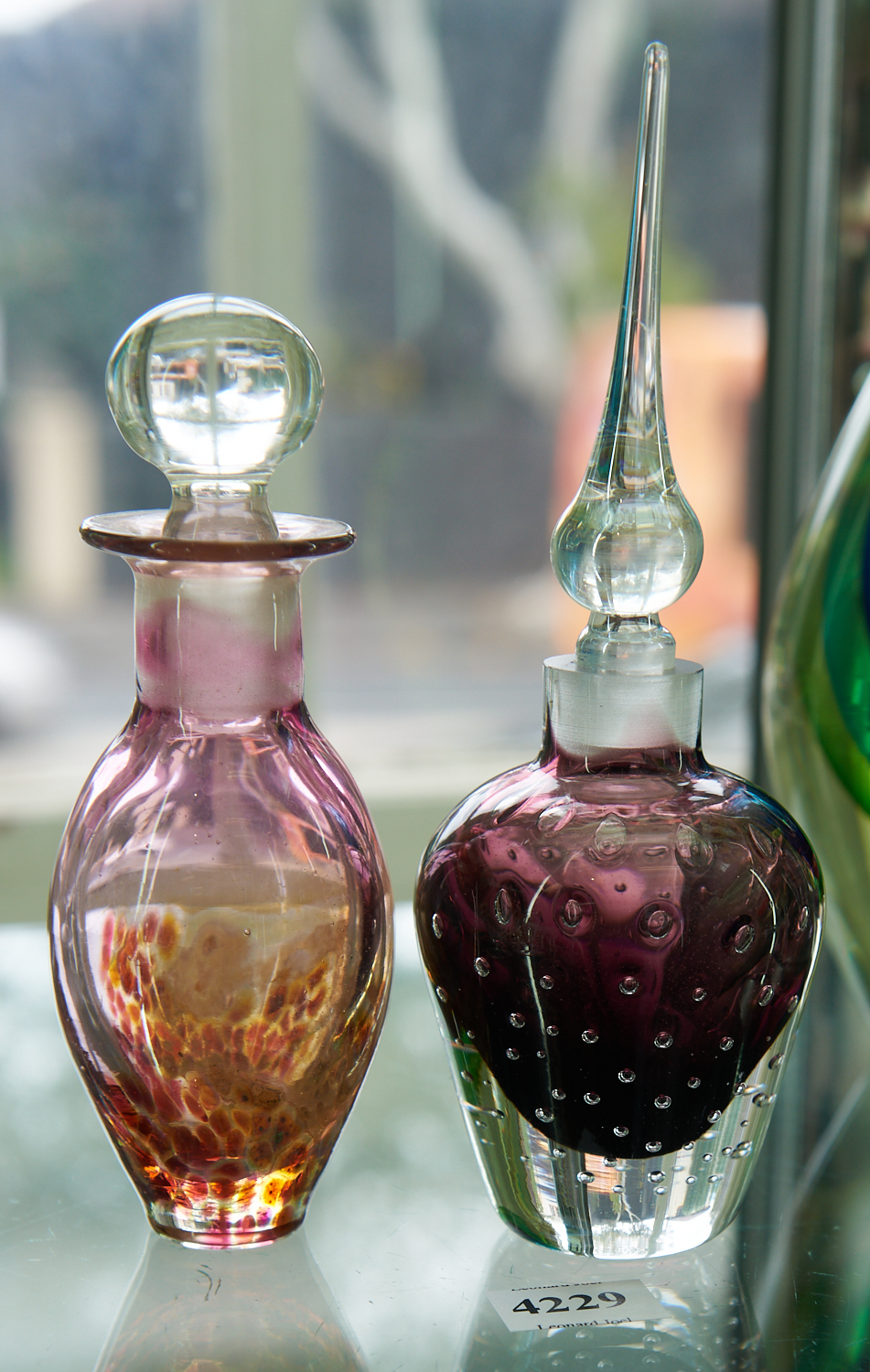 TWO HAND-BLOWN GLASS PERFUME BOTTLES, ONE SIGNED (19 CM HIGHEST), LEONARD JOEL LOCAL DELIVERY SIZE: SMALL