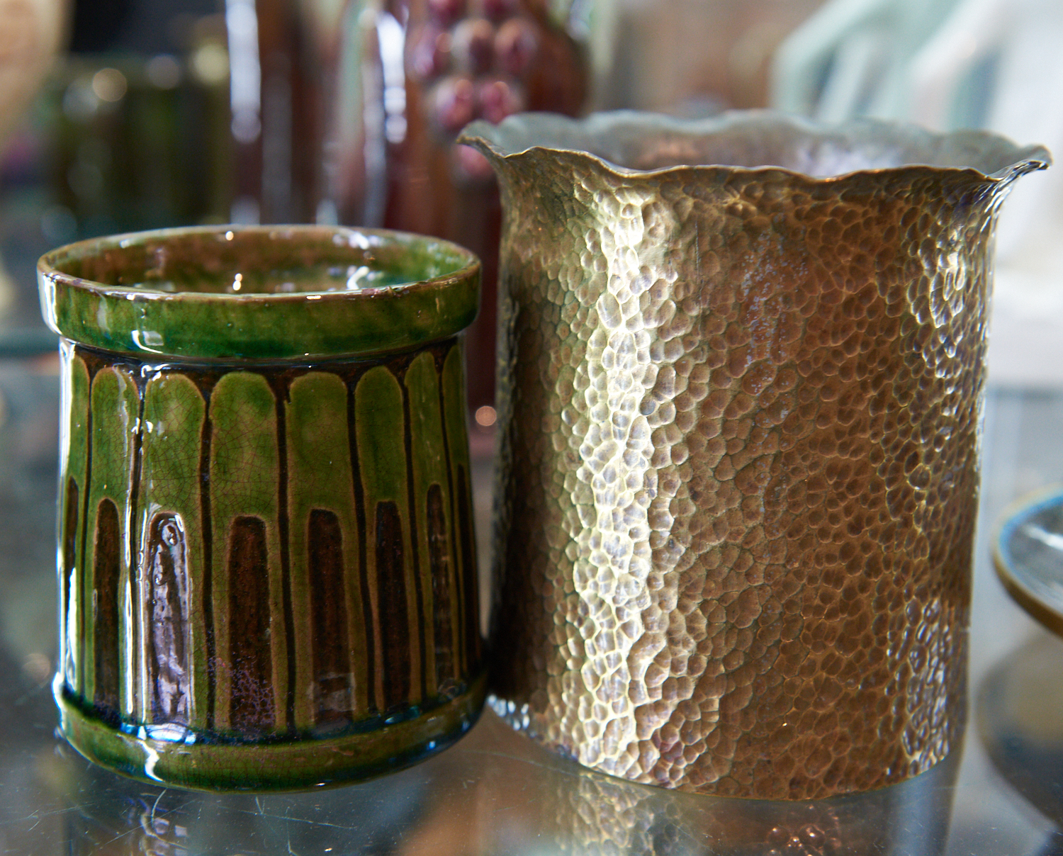 AN ARTS AND CRAFTS HAMMERED BRASS VASE OR POT PLANT HOLDER AND A CERAMIC GREEN GLAZED ARTS AND CRAFTS MUG (12 CM H), LEONARD JOEL LOCAL DELIVERY SIZE: SMALL