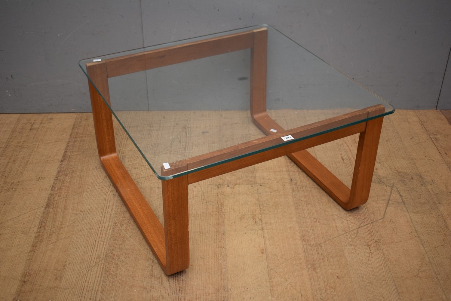 A MID-CENTURY GLASS TOPPED COFFEE TABLE (36H x 66W x 66D CM) (LEONARD JOEL DELIVERY SIZE: MEDIUM)