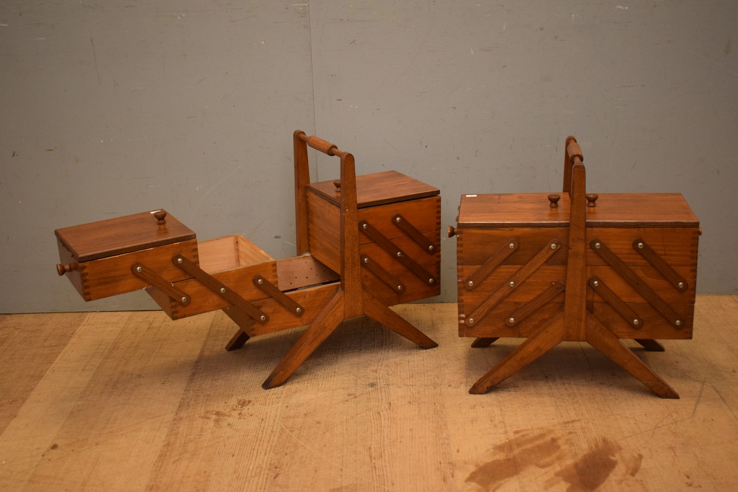 A PAIR OF MID-CENTURY SEWING BOXES (A/F) (H48 X W50 X D28 CM) (LEONARD JOEL DELIVERY SIZE: MEDIUM)