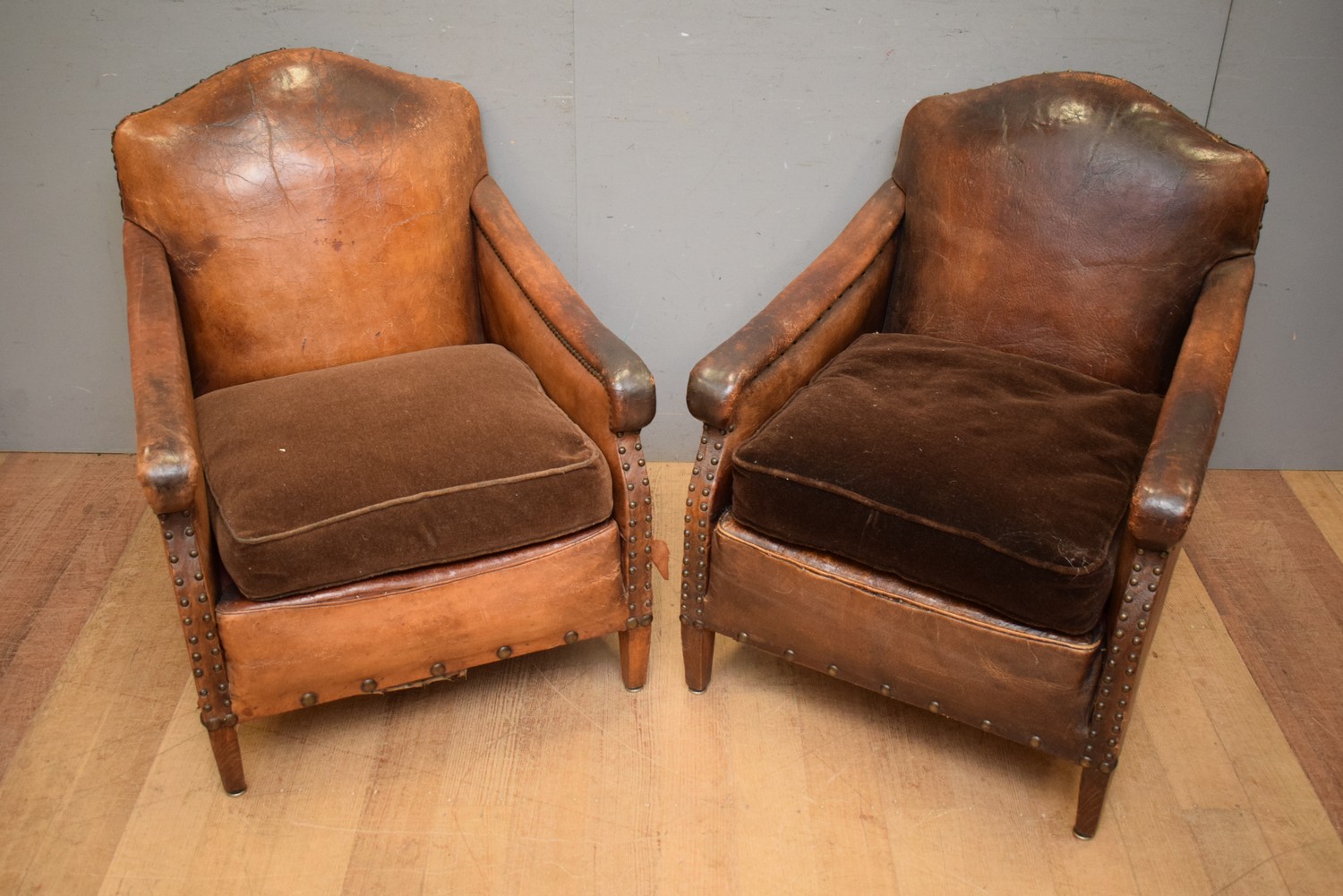 PAIR OF FRENCH LATE 19TH CENTURY LEATHER CLUB CHAIRS, C.1880'S-1900'S (A/F) (85H x 71W x 82D CM) (LEONARD JOEL DELIVERY SIZE: LARGE)