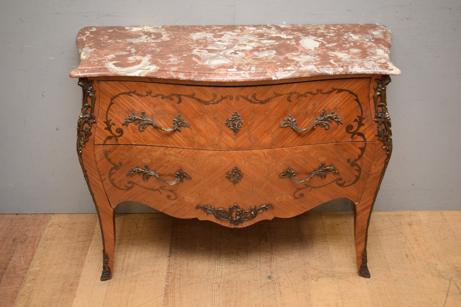 FRENCH LOUIS XV KINGWOOD MARBLE TOP MARQUETRY COMMODE, C.1930'S (COMES WITH KEY) (86H x 116W x 54D CM) (PLEASE NOTE THIS HEAVY ITEM MUST BE REMOVED BY CARRIERS AT THE CUSTOMER'S EXPENSE. LEONARD JOEL STAFF CANNOT ASSIST CARRYING THIS ITEM) (X-LARGE ITEM)
