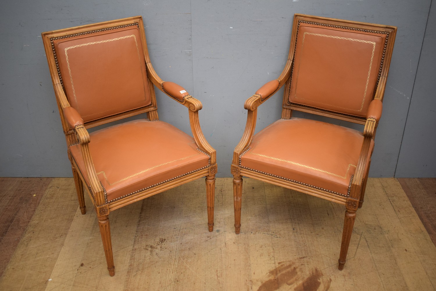 PAIR OF SUPERB FRENCH 19TH CENTURY LOUIS XVI BEECH & LEATHER EMBOSSED FAUTEUILS, C.1880'S (92H x 55W x 57D CM) (LEONARD JOEL DELIVERY SIZE: LARGE)