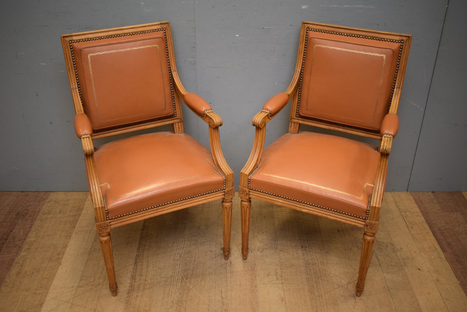 PAIR OF SUPERB FRENCH 19TH CENTURY LOUIS XVI BEECH & LEATHER EMBOSSED FAUTEUILS, C.1880'S (93H x 53W x 58D CM) (LEONARD JOEL DELIVERY SIZE: LARGE)