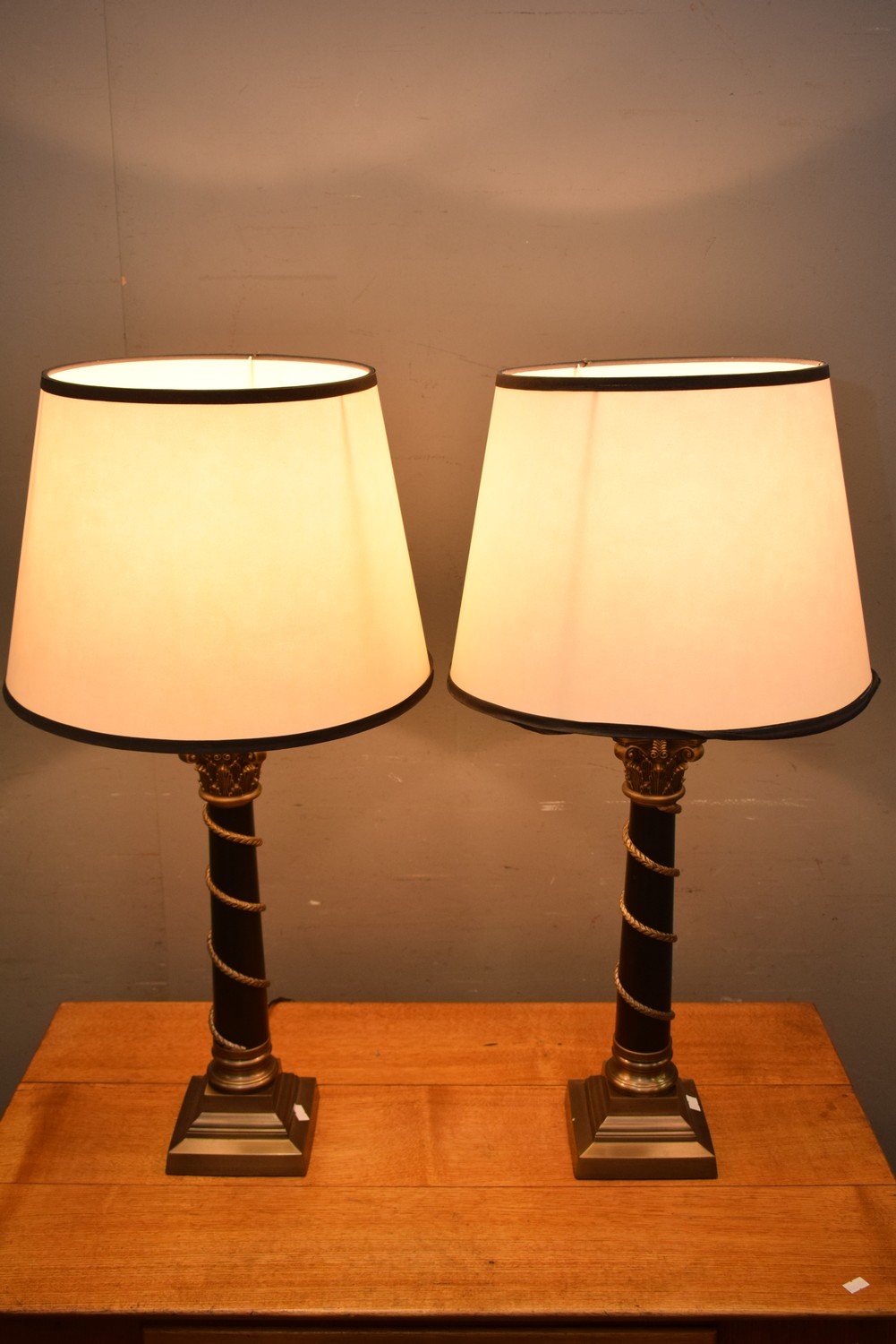 A PAIR OF CLASSICAL STYLE COLUMN LAMPS WITH SHADES ( 77H CM) (LEONARD JOEL DELIVERY SIZE: MEDIUM)