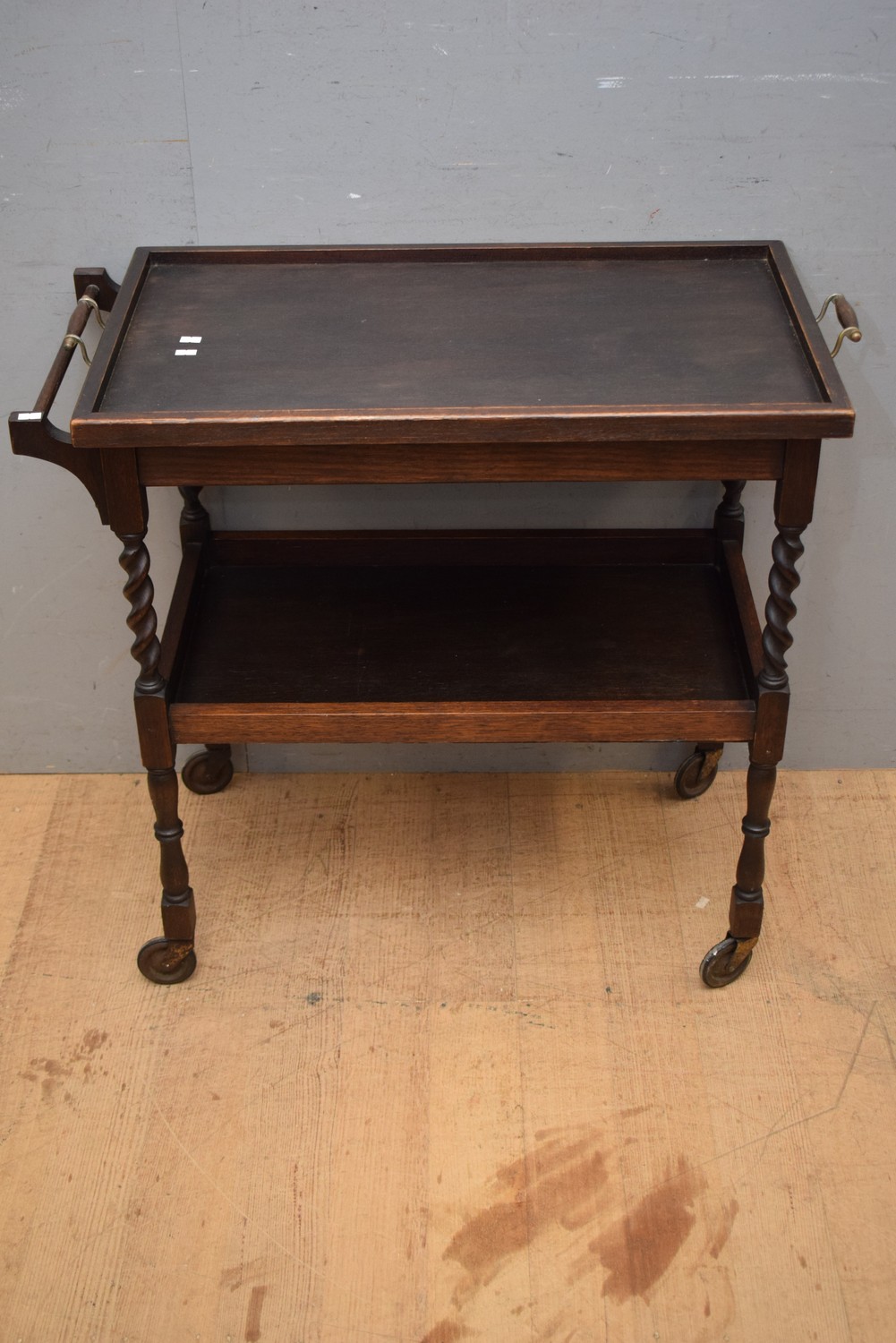 A JACOBEAN STYLE TWO TIER AUTO TROLLEY WITH LIFT OFF TRAY ( 79H X 88W X 46D CM) (LEONARD JOEL DELIVERY SIZE: LARGE)