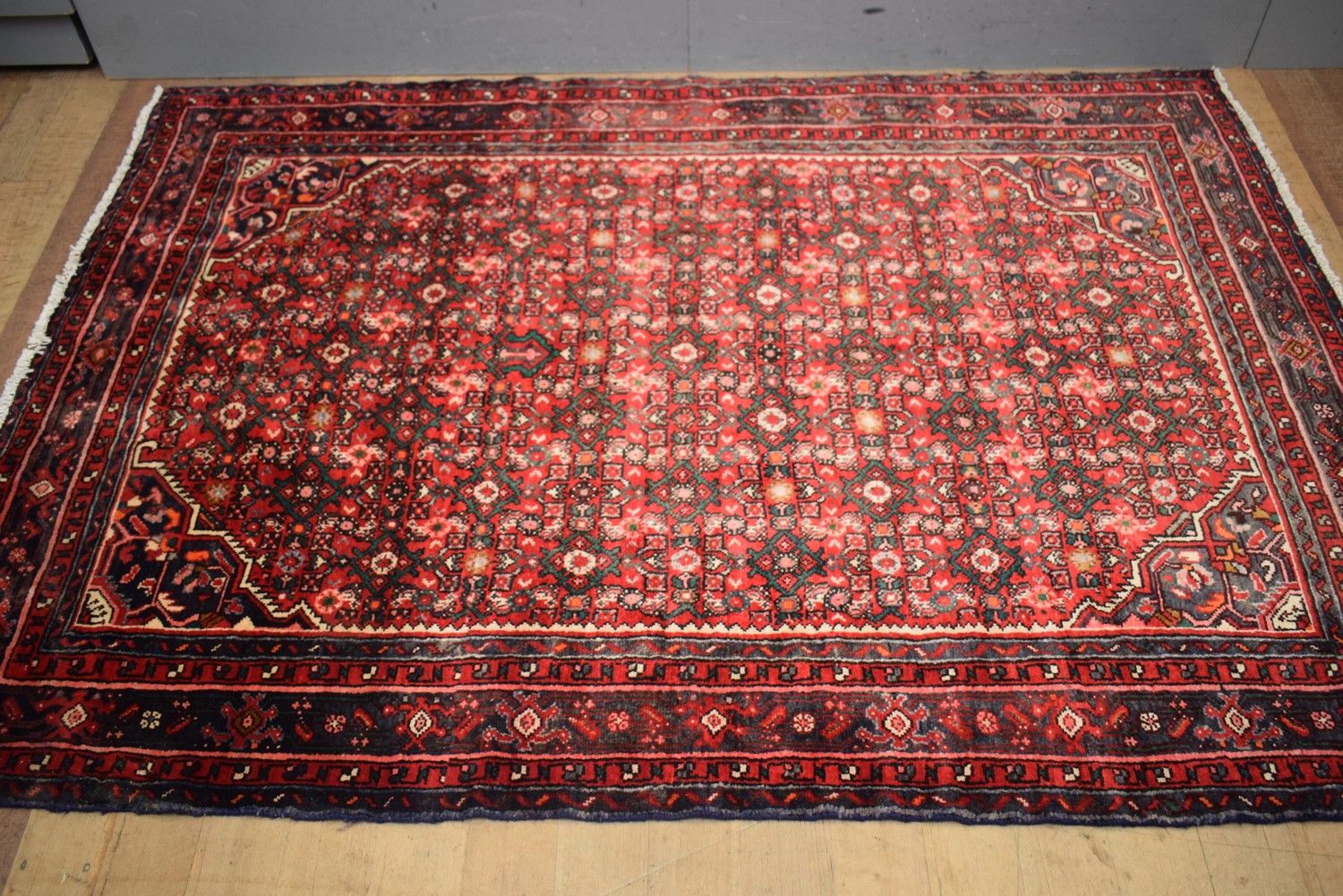 A PERSIAN WOOLLEN RUG IN RED TONES (A/F) (212 x 150 CM) (LEONARD JOEL DELIVERY SIZE: MEDIUM)