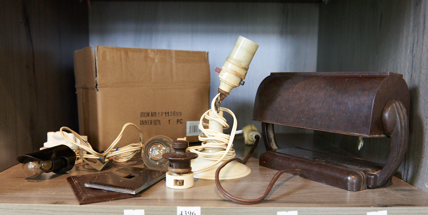 A SHELF OF BAKELITE ITEMS TOGETHER WITH BULBS AND FUSES, LEONARD JOEL LOCAL DELIVERY SIZE: SMALL