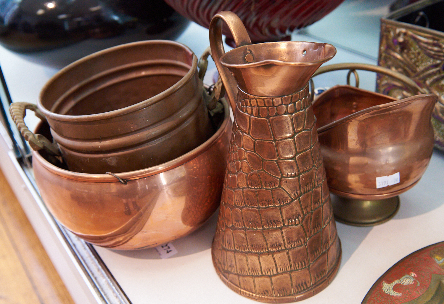 A GROUP OF COPPER ITEMS INCLUDING CROCODILE EMBOSSED JUG , LEONARD JOEL LOCAL DELIVERY SIZE: SMALL