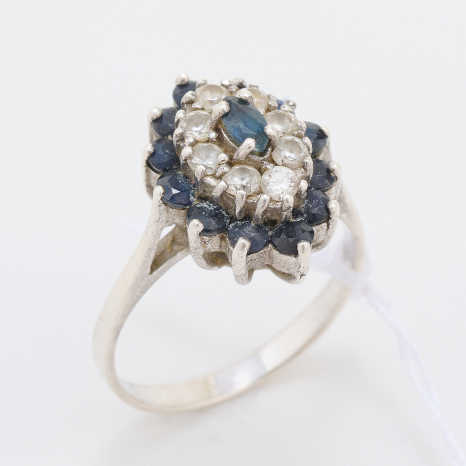 A BLUE AND WHITE SAPPHIRE CLUSTER RING IN 9CT WHITE GOLD, RING SIZE S, 4.8GMS