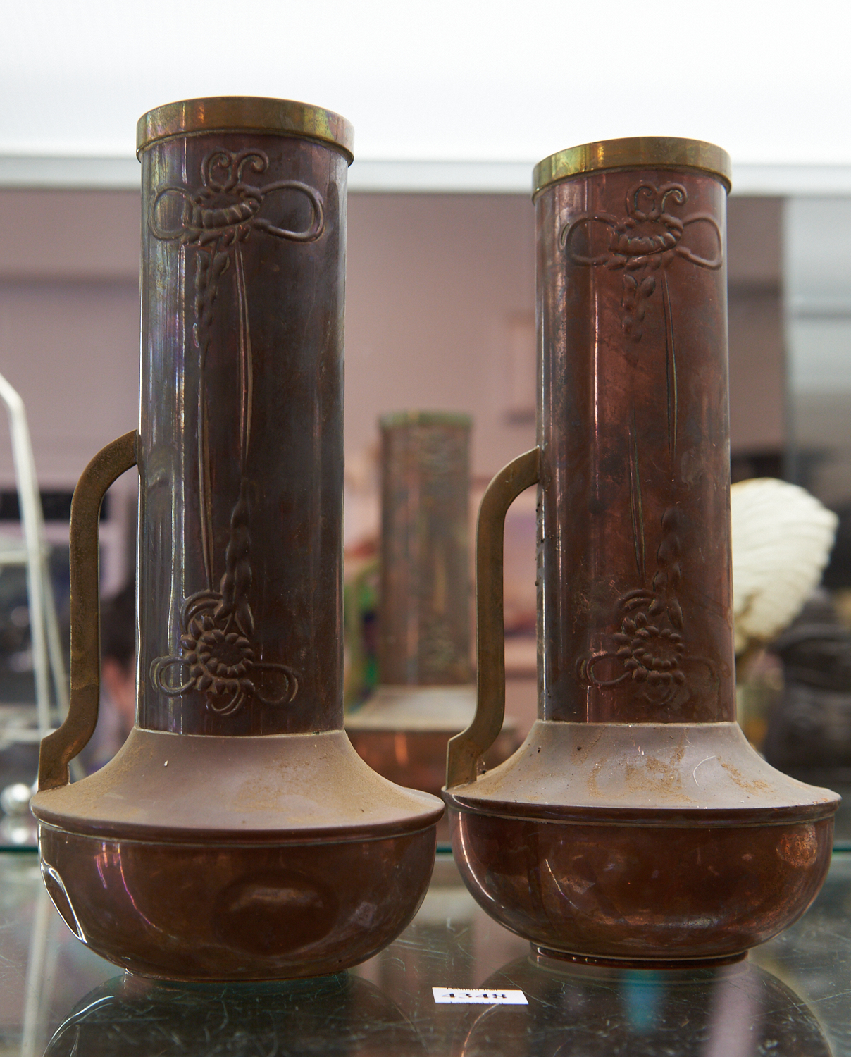 A PAIR OF COPPER AND BRASS ART NOUVEAU VASES H.25CM, LEONARD JOEL LOCAL DELIVERY SIZE: SMALL
