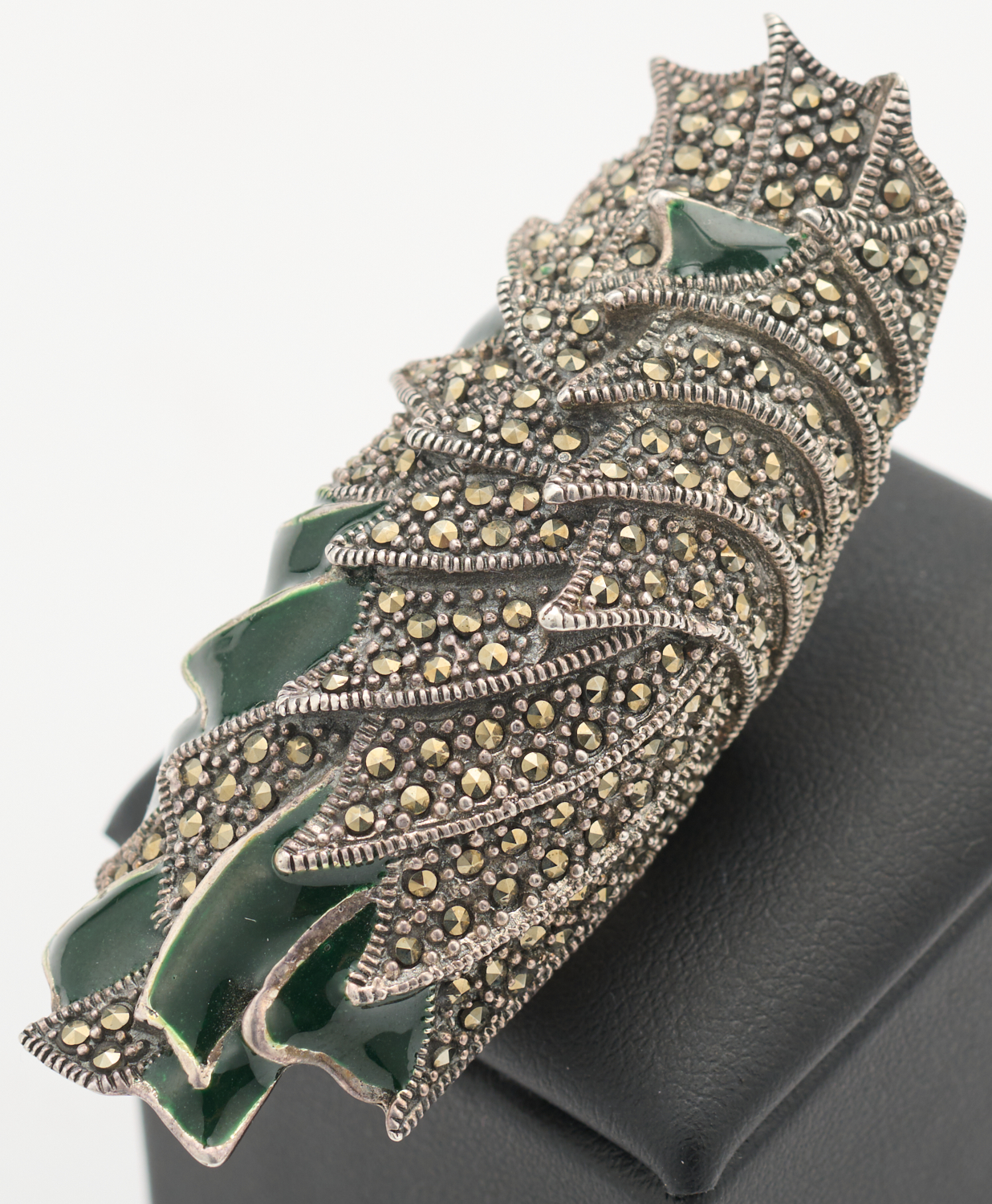 A MARCASITE AND ENAMEL RING IN STERLING SILVER, RING SIZE M