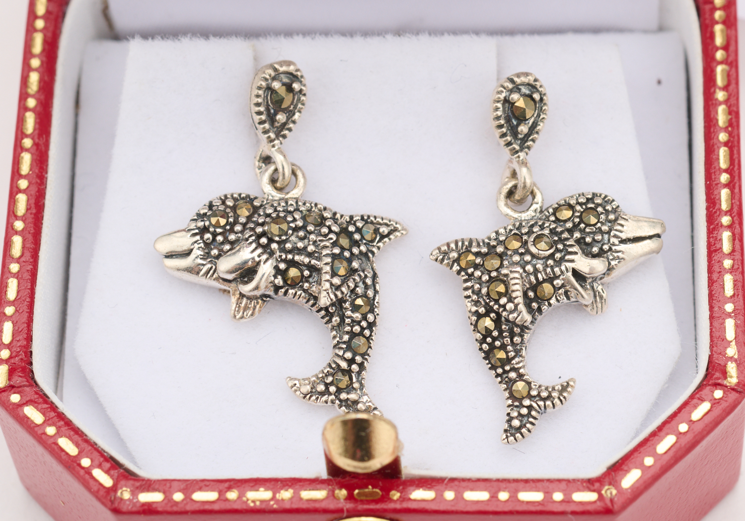 A PAIR OF MARCASITE DOLPHIN EARRINGS IN STERLING SILVER, BOXED