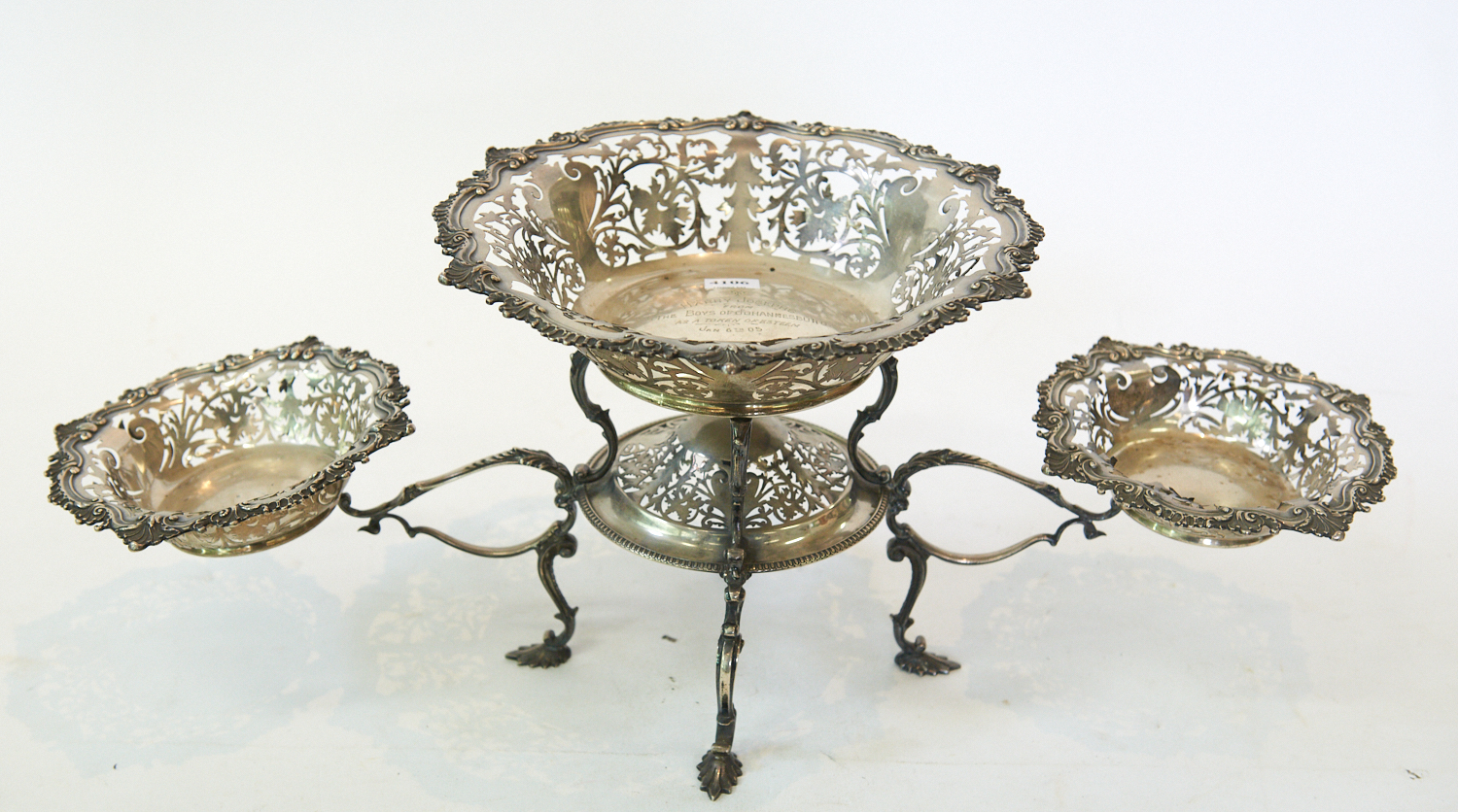 A COMMEMORATIVE STERLING SILVER CENTERPIECE COMPRISING THREE PIERCED BASKETS, MOUNTED ON A STAND W.59CM, LEONARD JOEL LOCAL DELIVERY SIZE: SMALL